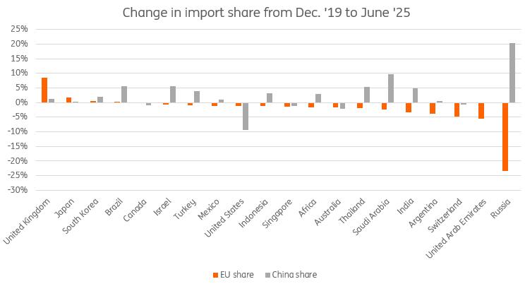 Data in USD. The chart shows the change in the shares of their total imports coming from the EU or China Source: IMF DOTS, ING Research calculations 2025 shows an acceleration of Chinese competitiveness compared to Europe
