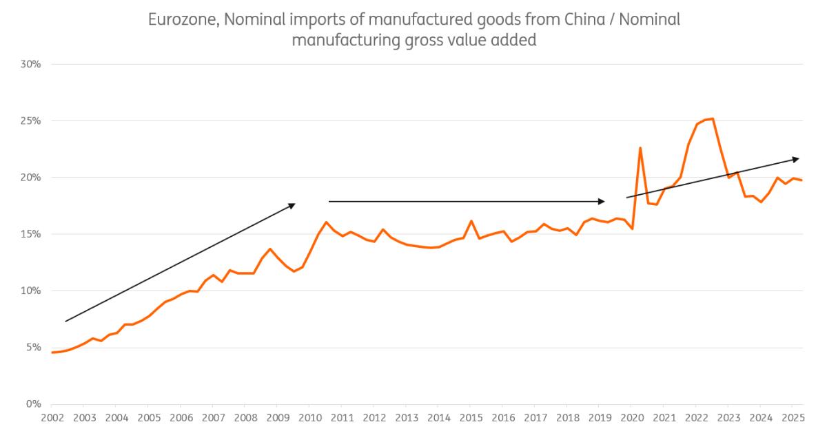 Chart 1 below shows a crude measure of China's increased relevance in the European market for goods over time and illustrates the ratio of European imports of manufactured goods from China to European manufacturing. We use this for the benefit of the timeliness of data, as we can use quarterly figures to take the 2025 developments on board.