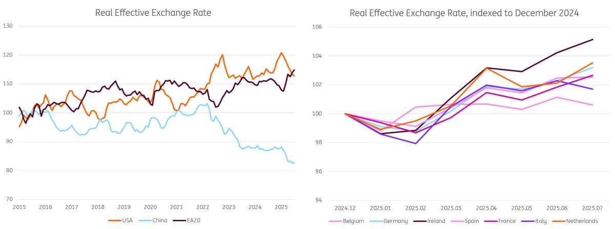 So, while increased Chinese capacity and subsequent larger import penetration in the European and larger emerging markets are nothing new, we do note an acceleration since the start of the year. The new impulse to the trade war under the second Trump administration has boosted both American and Chinese competitiveness when looking at the real effective exchange rate, a common measure of cost competitiveness. This is in part driven by the weaker US dollar, which has also caused a devaluation of the renminbi against the euro (also keep in mind that many European imports from China are often paid in US dollars, which makes Chinese imports automatically more competitive due to the USD devaluation).