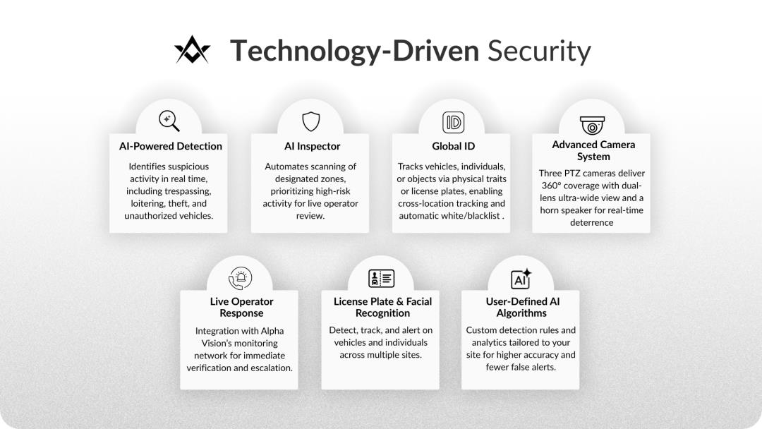Alpha Vision is a leading provider of AI-powered physical security solutions. Its flagship Physical AI Platform integrates advanced hardware, intelligent software, and automation workflows to deliver real-time threat detection, autonomous deterrence, and operational intelligence across industries including retail, multifamily, and construction.