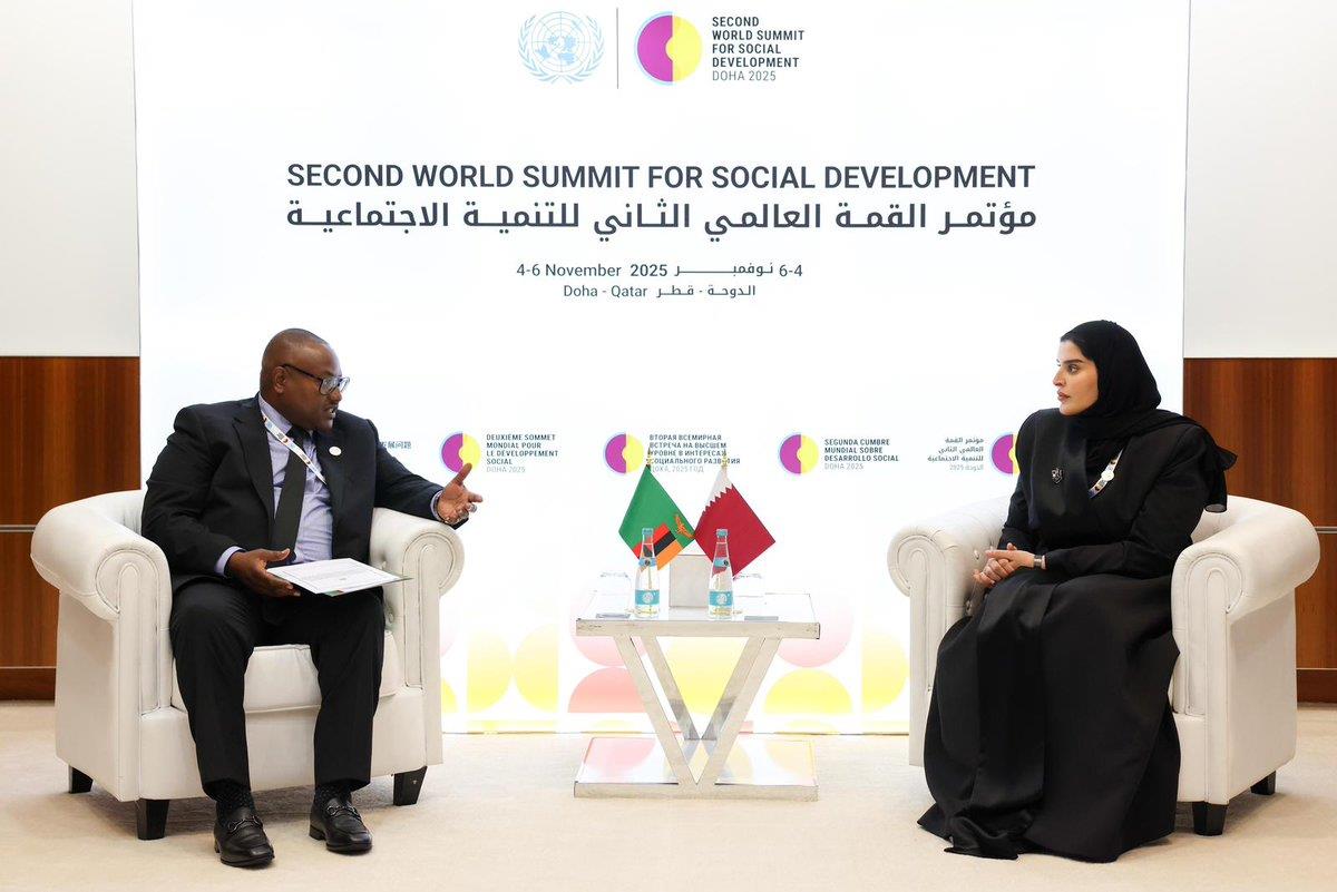 Doha, Qatar: Minister of State for International Cooperation HE Dr. Maryam bint Ali bin Nasser Al Misnad met Wednesday with Minister of Foreign Affairs and International Cooperation of the the Republic of Zambia HE Mulambo Haimbe, on the sidelines of the Second World Summit for Social Development, currently held in Doha.