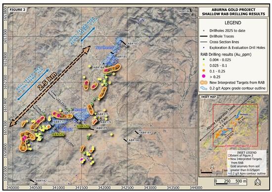 Figure 2 shows the location of ABR179 with the other completed drillholes, the approximate 0.2 g/t gold contour outline of the drilled prospects to date, and the newly identified shallow RAB targets. The Figure 2 map also shows that only some 20%, or collectively 1.5km, of the overall 7km long Aburna Project Gold trend has been tested by drilling. The Company anticipates based upon the team's experience at Aburna that further prospects will develop with future exploration and drilling along this trend.