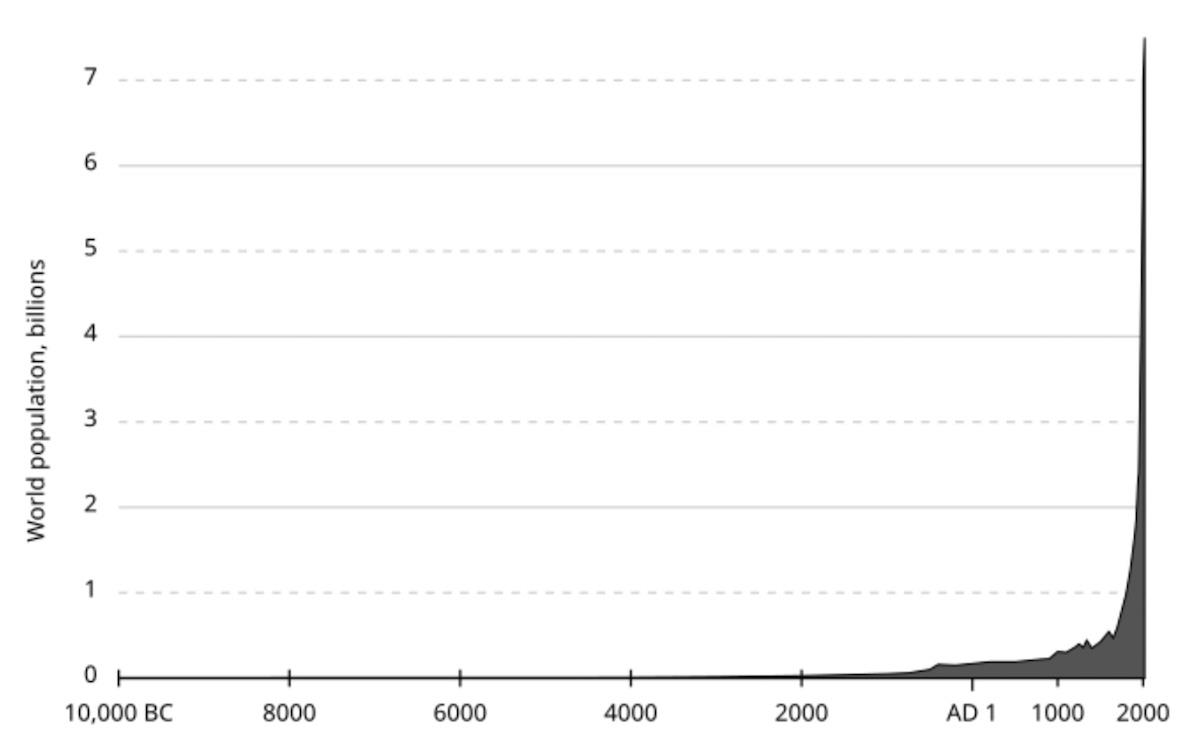The graph above shows that for 6,000 to 7,000 years after the start of the agricultural revolution and the end of the ice age, the population remained stable. It began to grow from the 4th millennium BC, with the dawn of civilizations, increasing from 7 to 60 million people by 750 BC.