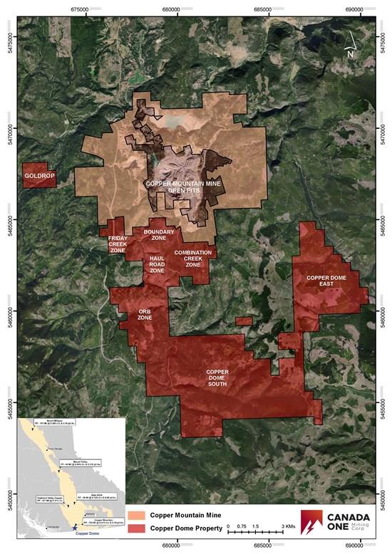 Copper Dome is located in the lower Quesnel Trough porphyry belt, one of British Columbia's most prolific mining districts. The Project directly adjoins Hudbay Minerals Inc.'s (TSX: HBM) producing Copper Mountain Mine to the north which hosts Proven and Probable Reserves of 702 million tonnes grading 0.24% Cu, 0.09 g/t Au, and 0.72 g/t Ag (hudbayminerals). Multiple mineralized zones have been identified across the Property, with historical drilling confirming high-grade copper associated with northeast-trending structures similar to those hosting mineralization at Copper Mountain.