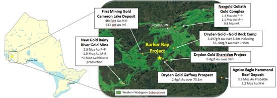 The geologic similarities to the Kenwest Deposit (25 kilometers to the east) operated by Dryden Gold Corp. (TSXV: DRY) where a gold intercept of 3,497 g/t over 8.5 m including 53,700 g/t gold over 0.55 meters in hole KW-11-26 underscore the potential for ultra-high grade gold mineralization (see Ontario Mineral Deposit Inventory MDI52F07NE00002 ).