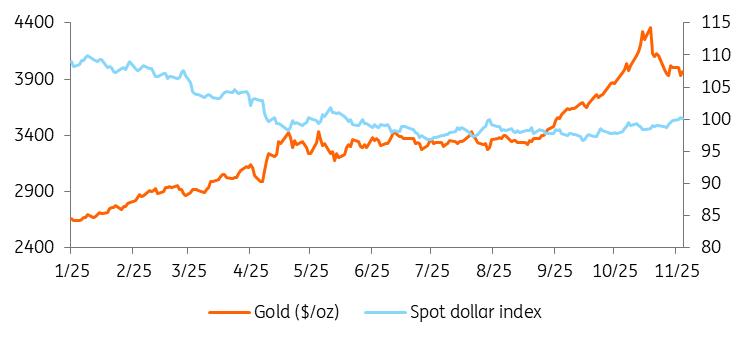 Gold surged to a record in October above $4,300/oz, as retail investors piled in, but prices have since retreated below $4,000/oz amid profit-taking, improved risk sentiment, and uncertainty over investor positioning amid the ongoing US government shutdown. The pullback in prices was accompanied by withdrawals from gold-backed exchange-traded funds.
