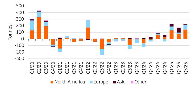 Despite the recent withdrawals, we expect ETF buying to resume as the US Fed is likely to continue cutting interest rates. Rates traders still see better than 70% odds for an interest-rate cut in December.