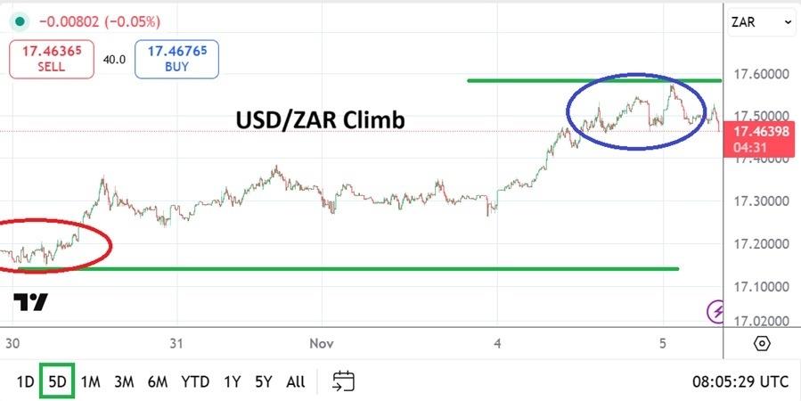(MENAFN- Daily Forex) In late night trading the USD/ZAR came within the 17.58000 vicinity, but after challenging values not seen since the second week of September, the currency pair has sold off a bit and is now around 17.46400.Swift changes in value are likely causing speculators rather dynamic trading results in the USD/ZAR. The currency pair came within the 17.58000 ratio late last night as the USD surged in Forex across the board. The USD/ZAR then shifted slightly lower and as of this writing is near the 17.46400 level, but with a wide spread being clearly demonstrated.Forex conditions in all major currency pairs have been volatile the past week. Last Wednesday the USD/ZAR declined to the 17.0700 vicinity, this as financial institutions positioned themselves before the U.S Federal Reserve interest rate announcement. After the Fed cut the Federal Funds Rate by 25 basis points as anticipated, the insistence of the U.S central bank that they had no outlook – except for a uncertainty – for December's interest rate decision caused anxiousness, Forex became rather combustible Lows Turn into Mid-Term Highs QuicklyThe USD/ZAR had been one of the better performing bearish currency pairs over the past month. The USD/ZAR consistently showed that financial institutions were leaning into a weaker USD centric stance. However, after touching lower realms last week momentarily, the strong reversal higher that has ensued has delivered a reminder the USD/ZAR can move very fast for day traders.Top Forex Brokers1 Get Started 74% of retail CFD accounts lose money Broad markets today may continue to produce nervousness that creates risk adverse sentiment. However while global equities may struggle, there are also technical charts via the U.S Dollar Index that show the recent climb of the USD is now touching resistance via a six month chart that may make some speculators believe a reversal may develop. Yet, this doesn't guarantee that stronger selling in the USD/ZAR will ignite in the short-term. The higher ground in the USD/ZAR can certainly be looked upon suspiciously by those with bearish perspectives, but it should be done with caution in Short Supply for ForexWhile the Federal Reserve may not have an answer regarding its interest rate decision in December, some financial institutions may still believe the Fed will cut again.