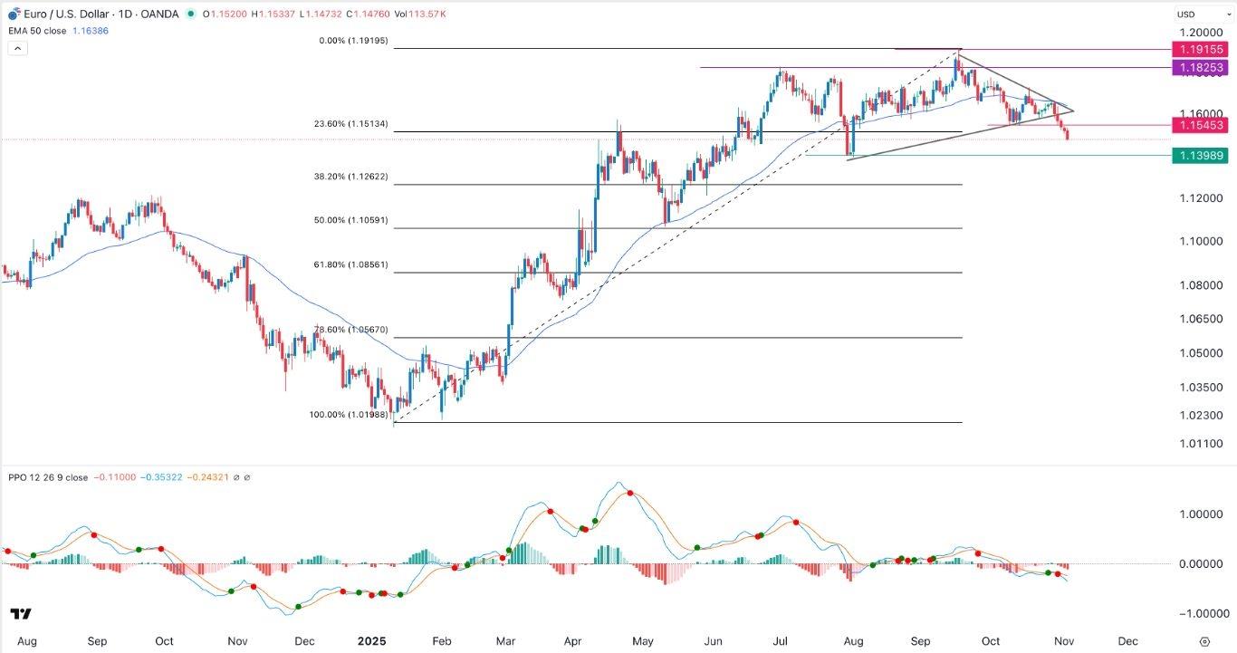 EURUSD Chart by TradingViewEUR/USD Technical AnalysisThe daily timeframe chart shows that the EUR/USD exchange rate has been in a strong downward trend in the past few months as the US dollar index rebounded.It has moved below the 23.7% Fibonacci Retracement level and the lower side of the symmetrical triangle pattern, a sign that bears have prevailed.The Percentage Price Oscillator (PPO) indicator has continued falling. Therefore, the path of the least resistance for the pair is bearish, with the next key support to watch being at 1.14000, followed by the 38.2% retracement level at 1.1262.Ready to trade our free trading signals? We've made a list of the best European brokers to trade with worth using.
