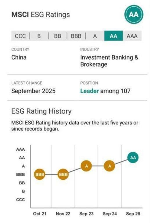 MSCI, the international index provider, recently released its 2025 ESG (Environmental, Social and Governance) rating for China Securities Co., Ltd. (601066; 6066). The Company's rating was raised from“A” to“AA”, representing another steady advancement along its ESG journey.