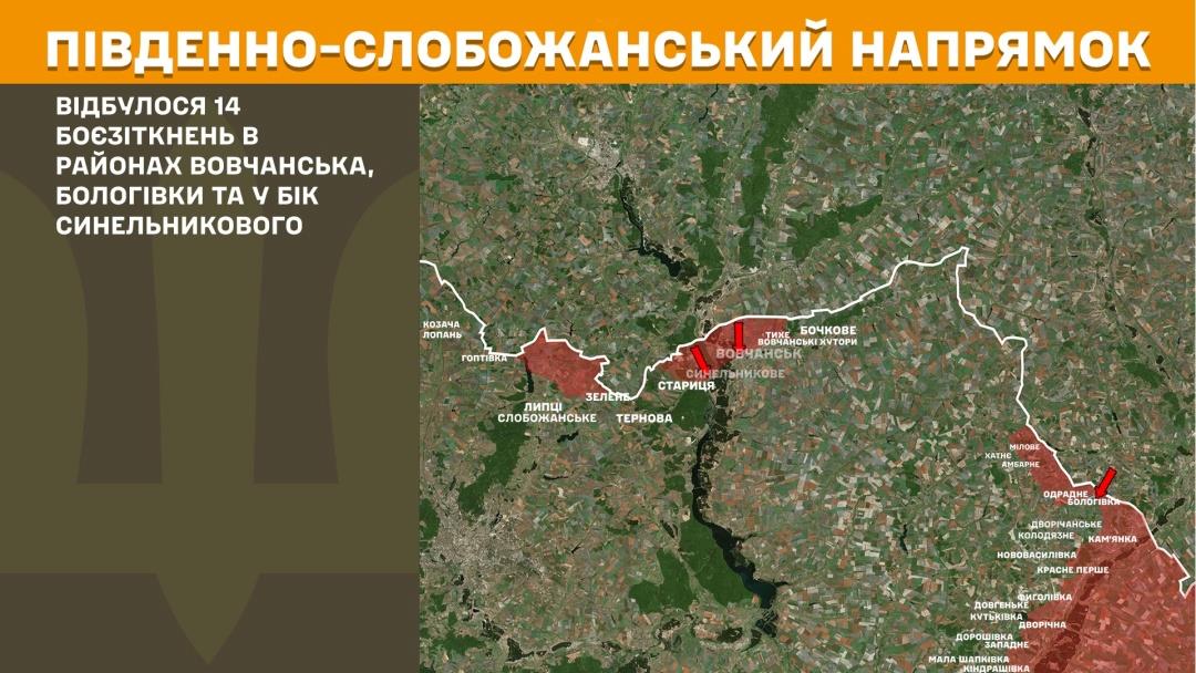 In the Southern-Slobozhanshchyna sector, there were 14 combat clashes near Vovchansk, Bolohivka, and toward Synelnykove.