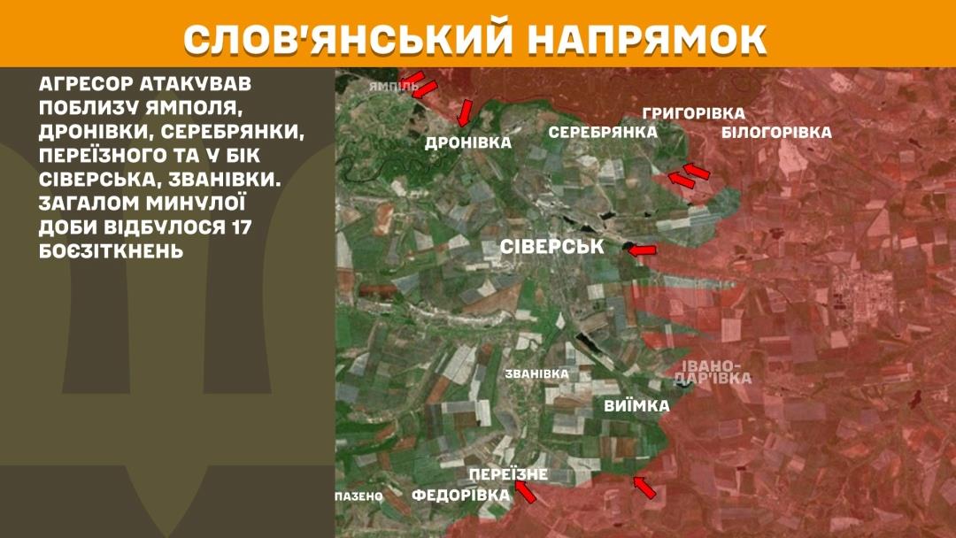 In the Sloviansk sector, Russian forces launched attacks near Yampil, Dronivka, Serebrianka, Pereizne, and toward Siversk and Zvanivka, with 17 clashes recorded.