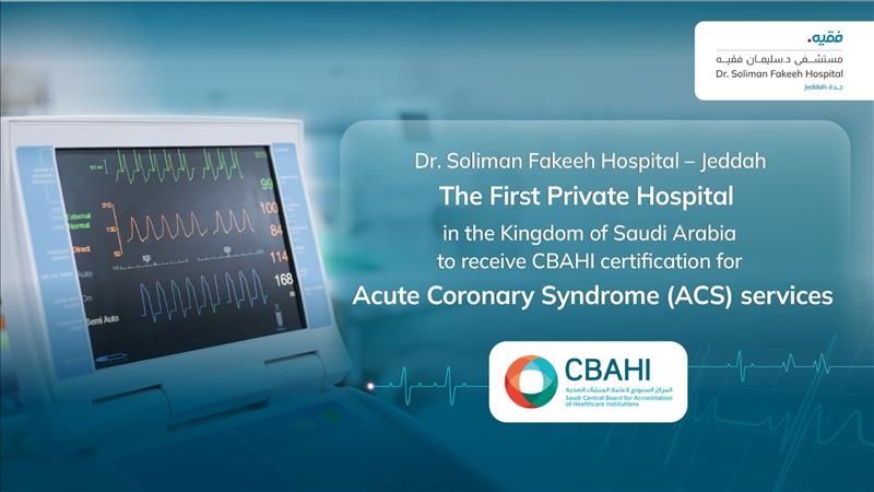 Dr. Soliman Fakeeh Hospital – Jeddah has announced that it has received certification from the Saudi Central Board for Accreditation of Healthcare Institutions (CBAHI) for its Acute Coronary Syndrome (ACS) services, becoming the first private hospital in the Kingdom of Saudi Arabia to obtain this prestigious certification.