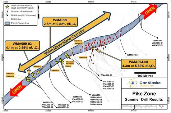 | WMA095-04, WMA095-05, WMA095-06 were drilled at an azimuth of 318 ̊ with an inclination of -76.6 ̊, collared at 477,248 mE / 6,396,492 mN, 600 m A.S.L. (UTM NAD83 Z13N) as daughter holes from WMA095. WMA095-04 intersected the unconformity at 811.1 metres, WMA095-05 at 809.0 metres, and WMA095-06 at 819.2 metres. WMA096, WMA096-01, WMA096-02, WMA096-04 were drilled at an azimuth of 300 ̊ with an inclination of -75.0 ̊, collared at 477,196 mE / 6,396,426 mN, 603 m A.S.L. (UTM NAD83 Z13N) as a pilot hole and subsequent daughter holes from WMA096. WMA096 intersected the unconformity at 821.5 metres, WMA096-01 at 818.9 metres, WMA096-02 at 817.4 metres, and WMA096-04 at 825.9 metres. WMA099, WMA099-01, WMA099-02, and WMA099-03, and WMA099-04 were drilled at an azimuth of 310 ̊ with an inclination of -75.0 ̊, collared at 477,041 mE / 6,396,365 mN, 607 m A.S.L. (UTM NAD83 Z13N) as a pilot hole and subsequent daughter hole from WMA099. WMA099 intersected the unconformity at 815.9 metres, WMA099-01 at 821.6 metres, WMA099-02 at 823.2 metres, WMA099-03 at 821.0 metres, and WMA099-04 at 815.0 metres. Intersection interval is composited above a cut-off grade of 0.1% eU3O8 with a maximum of 1.0 m of internal dilution. All reported depths and intervals are drill hole depths and intervals, unless otherwise noted, and do not represent true thicknesses, which have yet to be determined. Radiometric equivalent ("eU3O8") derived from a calibrated gamma downhole probe. |