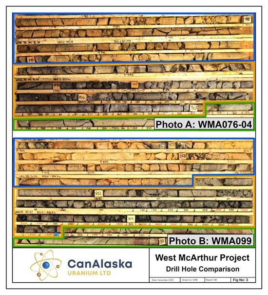 During active exploration programs drillholes are radiometrically logged using calibrated downhole GeoVista NGRS and TGGS (Triple GM) gamma probes which collect continuous readings along the length of the drillhole. Preliminary radiometric equivalent uranium grades ("eU3O8") are then calculated from the downhole radiometric results. The probe is calibrated using an in-house algorithm calculated from the calibration of the probe at the Saskatchewan Research Council facility in Saskatoon and from the comparison of probe results against previously reported geochemical analyses. At extremely high radiometric equivalent uranium grades, downhole gamma probes may become saturated, resulting in the probe being overwhelmed, which in turn can create difficulties in accurately determining extremely high-grade radiometric equivalent uranium grades, and a cap may be applied to the grade. The equivalent uranium grades are preliminary and are subsequently reported as definitive assay grades following sampling and chemical analysis of the mineralized drill core. In the case where core recovery within a mineralized intersection is poor or non-existent, radiometric grades are considered to be more representative of the mineralized intersection and may be reported in the place of assay grades. Radiometric equivalent probe results are subject to verification procedures by qualified persons employed by CanAlaska prior to disclosure.