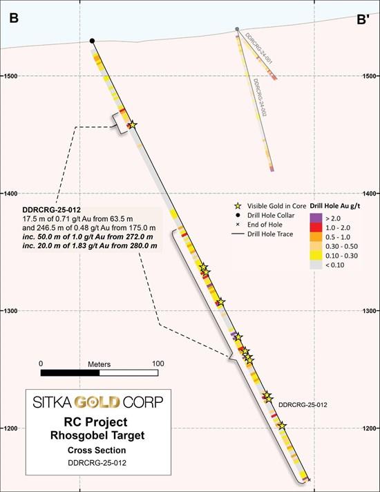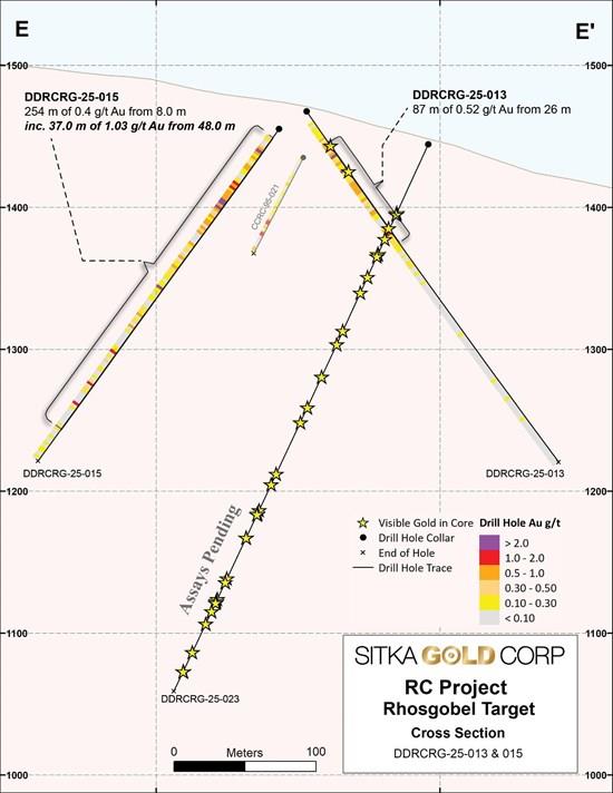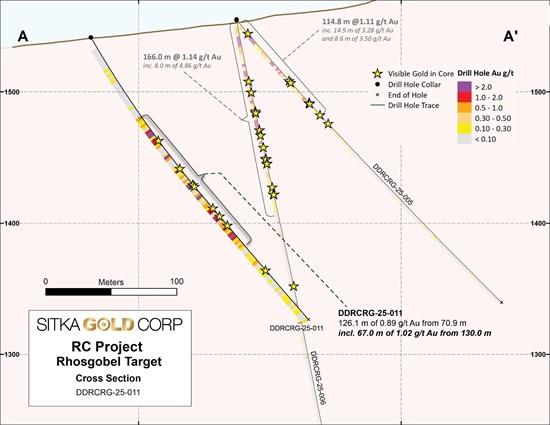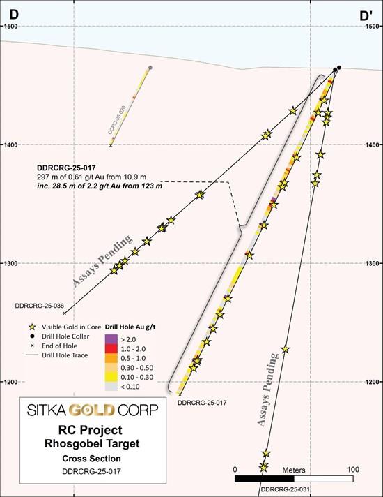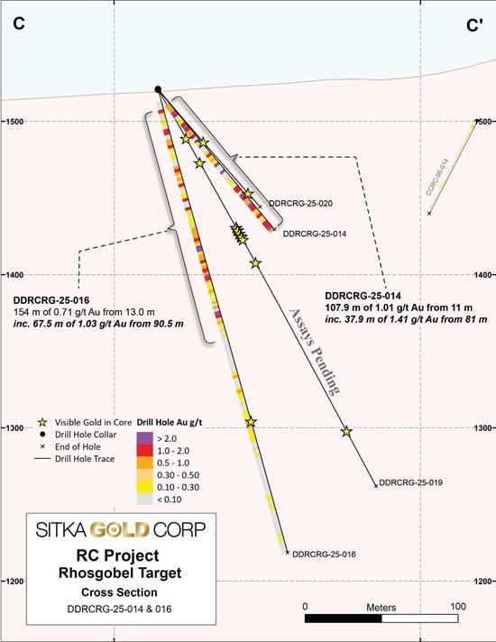 "We are very pleased with the continued success of our drilling at the Rhosgobel discovery, where results from an additional seven drill holes have significantly expanded the discovery footprint," stated Cor Coe, CEO and Director of Sitka. "The consistently strong gold grades and broad mineralized intervals, such as 107.9 metres of 1.01 g/t gold from surface in DDRCRG-25-014 and 297.0 m of 0.61 g/t Au from surface, including 28.5 metres of 2.20 g/t gold, in hole DDRCRG-25-017, further confirm the strength and continuity of this growing gold system that begins at surface. With visible gold observed in sheeted quartz veining across the entire 1.1 kilometre strike drilled this year and assays now confirming gold mineralization over 575 metres of strike, Rhosgobel is rapidly emerging as a significant new gold discovery within our RC Gold Project. The fact that 16 of the first 17 holes have returned intersections exceeding 100 gram-metres of gold further underscores both the scale and consistency of this system. We eagerly await results from the remaining 26 holes completed at Rhosgobel as we continue to define the size and potential of this exciting new gold zone."