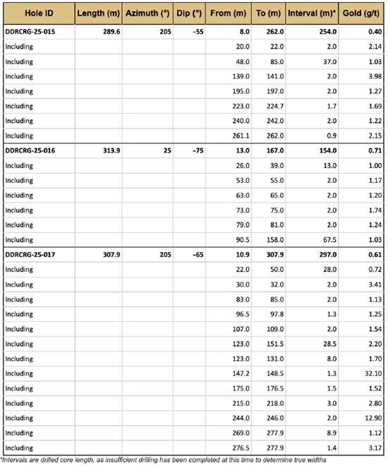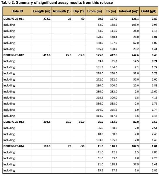 Rhosgobel discovery significantly expanded with results from an additional 7 drill holes completed in 2025 Highlights include DDRCRG-25-014 returning 107.9 m of 1.01 g/t Au from surface, including 37.9 m of 1.41 g/t Au; DDRCRG-25-016 returning 67.5 m of 1.03 g/t Au from surface; DDRCRG-25-011 returning 67.0 m of 1.02 g/t Au; DDRCRG-25-012 returning 50.0 m of 1.00 g/t Au; DDRCRG-25-015 returning 37.0 m of 1.03 g/t Au and DDRCRG-25-017 returning 297.0 m of 0.61 g/t Au from surface, including 28.5 m of 2.20 g/t Au