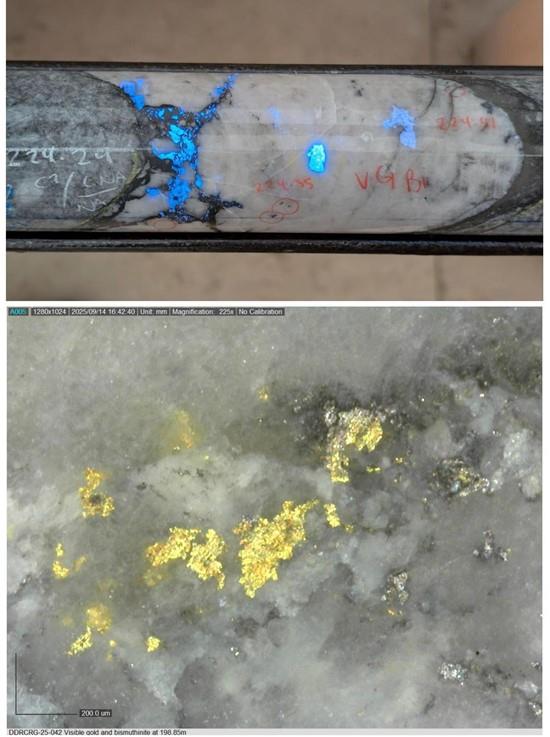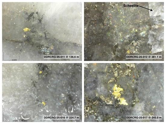 Figure 5: Examples of visible gold in Rhosgobel drilling. Note the large whitish scheelite (tungsten mineralization) crystal on the right side of the DDRCRG-25-012 photo.