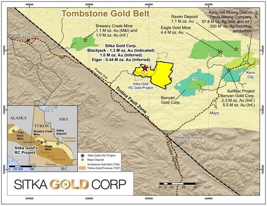 Sitka's 100% owned RC Gold Project consists of a 431 square kilometre contiguous district-scale land package located in the heart of Yukon's Tombstone Gold Belt. The project is located approximately 100 kilometres east of Dawson City, which has a 5,000 foot paved runway, and is accessed via a secondary gravel road from the Klondike Highway which is usable year-round and is an approximate 2 hour drive from Dawson City. It is the largest consolidated land package strategically positioned mid-way between the Eagle Gold Mine and the past producing Brewery Creek Gold Mine.