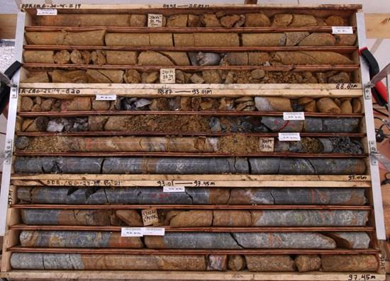 Figure 4: An example of drill core from DDRCRG-25-014 of strongly oxidized megacrystic quartz monzonite with sheeted quartz-sulphide veins from the 109.7 m interval of 1.01 g/t Au from 11.0 m, including 2.5 m of 5.86 g/t Au from 95.5 m.
