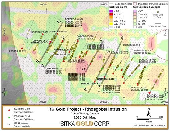Vancouver, British Columbia--(Newsfile Corp. - November 6, 2025) - Sitka Gold Corp. (TSXV: SIG) (FSE: 1RF) (OTCQB: SITKF) ("Sitka" or the "Company") is pleased to announce additional analytical results for seven diamond drill holes completed at the Rhosgobel intrusion target located at its 100% owned, road accessible RC Gold Project ("RC Gold" or the "Project") within the Yukon's prolific Tombstone Gold Belt. The 2025 drill program was successfully completed on time and under budget and consisted of 91 diamond drill holes for a total 31,841 metres including 43 holes (12,722 m) at Rhosgobel, 26 holes (10,494 m) at Blackjack/Saddle, 10 holes (4,401 m) at Eiger, 6 holes (2,171 m) at Contact Zone, 3 holes (1,044 m) at Pukelman, 2 holes (606 m) at May-Qu and 1 hole (401 m) at Bear Paw Breccia Zone. Assays are currently pending for 55 drill holes completed at RC Gold.