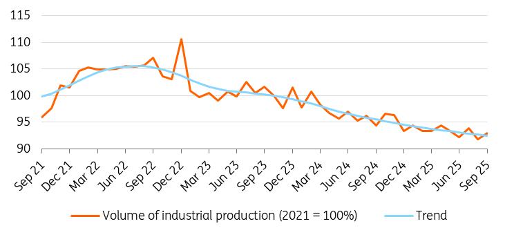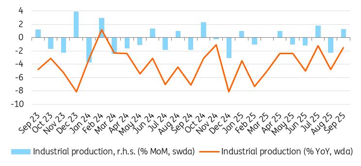 Following a negative surprise in August, the growth rate increased in September compared to the previous month. The volume of industrial products showed a positive correction after the summer shutdown, growing by 1.3% on a monthly basis. This is weaker than what we used to see after production restarted in autumn. The year-on-year index, adjusted for working days, came in with a 1.5% drop. Perhaps even more telling is the development of the fixed-base index. Due to the positive correction in September, the indicator relative to the average monthly performance for 2021 was able to grow, albeit remaining at -7%.
