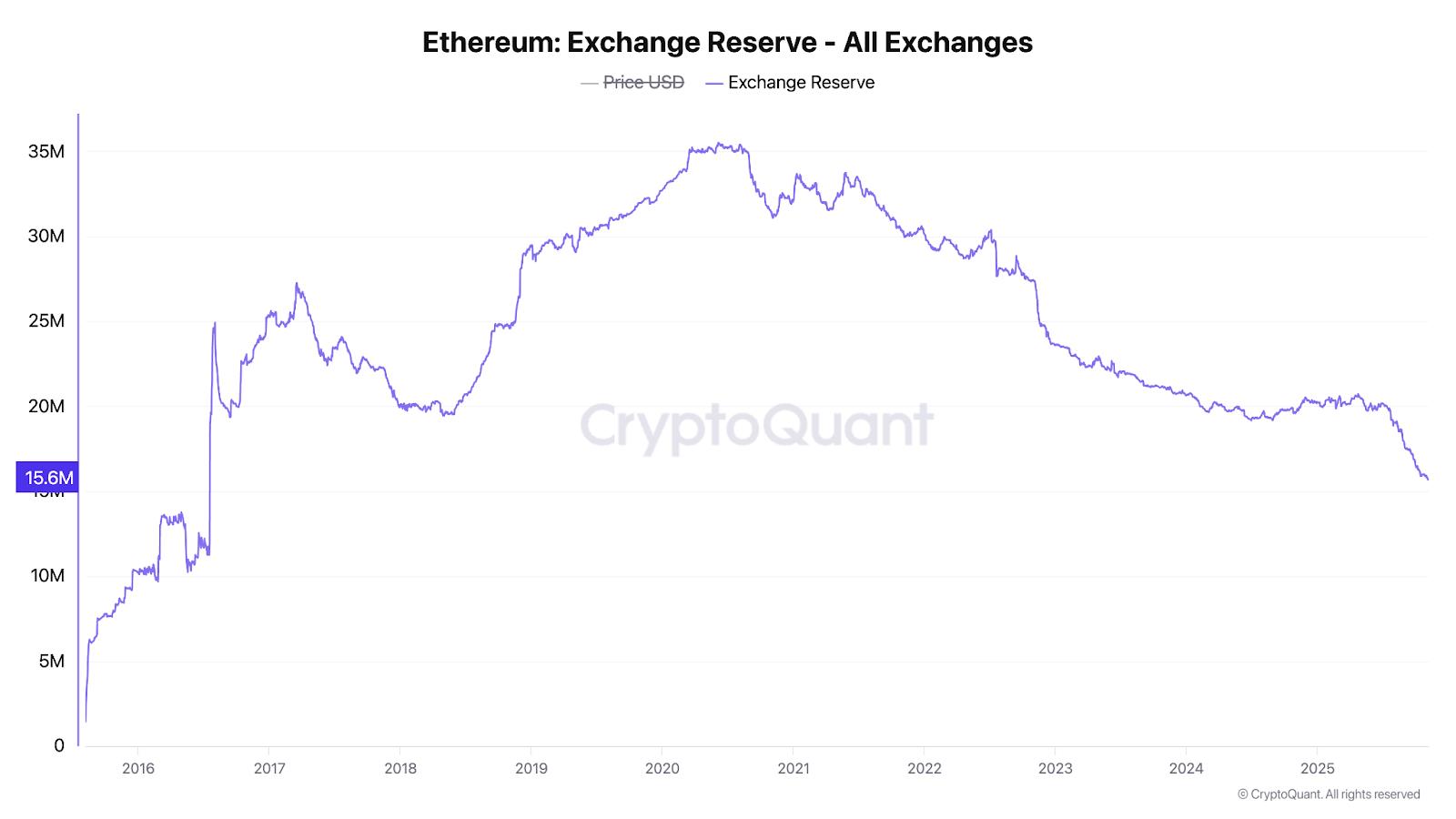 Beyond the individual movements, network data highlights a broader market shift. Analytics firm CryptoQuant reported that Ethereum exchange reserves have fallen to their lowest level since 2016.