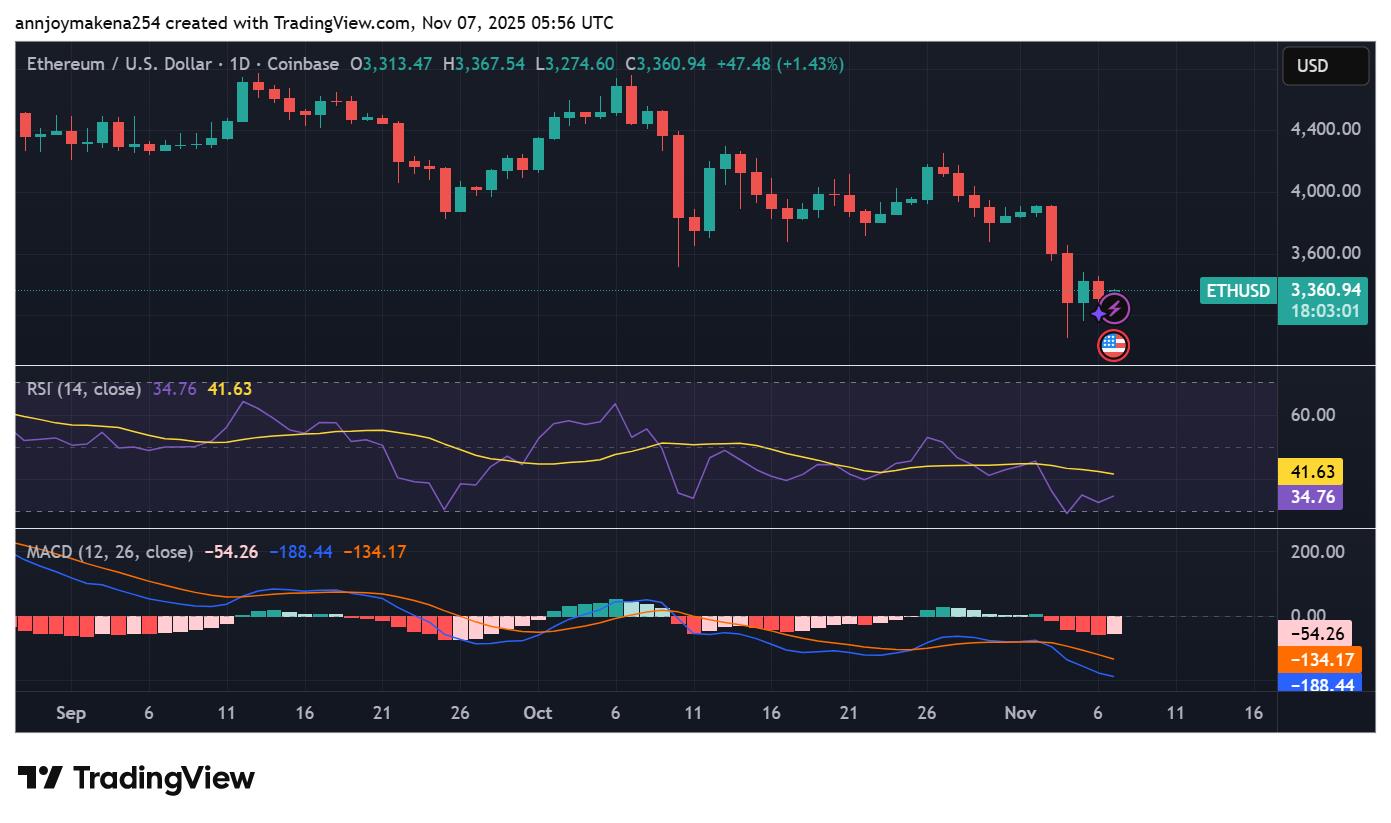 Ethereum is currently trading at $3,357, marking a 2.4% decline in the past 24 hours but showing signs of short-term stabilization. On the daily chart, ETH sits near $3,360.94, up 1.43% intraday, attempting to recover from its sharp retreat between $3,800 and $4,000. Buyers have defended the $3,274.60 level, indicating a temporary floor. However, bulls need to reclaim $3,500–$3,600 to reestablish upward momentum.