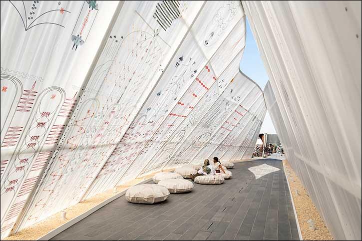 The King Abdulaziz Center for World Culture (Ithra) reveals a new commission by Spanish-based Studio Izaskun Chinchilla Architects; Boo Design Studio x Maryam AlHomaid create #MAJLIS, which reimagines the traditional Arab gathering space as a contemporary hub for storytelling, dialogue and cultural exchange; Swiss-born, New York-based experience designer Annabelle Schneider x ArtKōrero presents INTERLUDE: In Between is Now, an innovative wellness initiative that blends art and design to create immersive, multi-sensory spaces focused on enhancing mental and physical well-being; ANA Design Consultants present Traces of Musafir - a pavilion that draws inspiration from the idea of the musafir - a traveller, or temporary guest, in this world. Conceived as a circular, earth-like structure, it invites visitors to reflect on the impermanence of existence and the subtle marks each person leaves behind; Trend Group in collaboration with architect Joe Tabet of JT+Partners and the historic Orsoni Venezia 1888 factory, present a mosaic installation using eco-friendly Venetian Piastrina smalti glass tiles; WCI Lab by WeCreate International presents Breath Print, an installation that transforms the act of breathing into a visual and sensory experience through the use of patented interactive thermal technology.