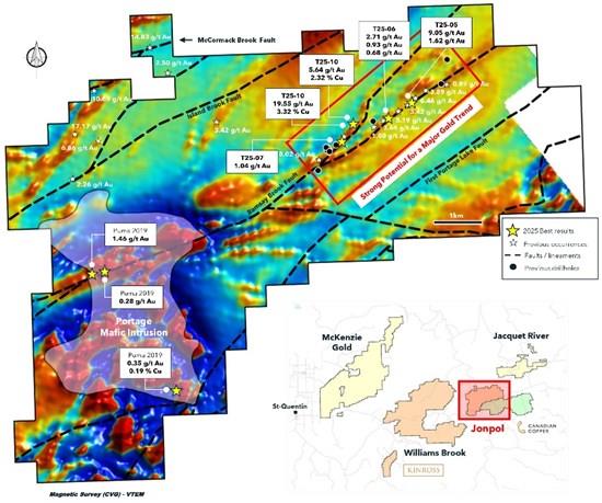 The Williams Brook Project (40,225 ha), optioned to Kinross Gold Corp (see October 24, 2024, News Release), comprises the Williams Brook Property, the Jonpol Property and the Portage Property. To earn a 65% interest in the project, Kinross can finance a minimum of $16.75 million in exploration expenditures over the next five years (including a firm commitment of $2 million with at least 5,000 metres of drilling in the first 18 months).