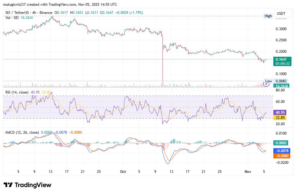 Short-Term Momentum Improves on Technical IndicatorsOn the 4-hour SEI/USDT chart from Binance, SEI trades around $0.1637, posting a 1.17% gain in the last session. Price data shows the token forming a potential support base near $0.16 after weeks of lower highs and lower lows.