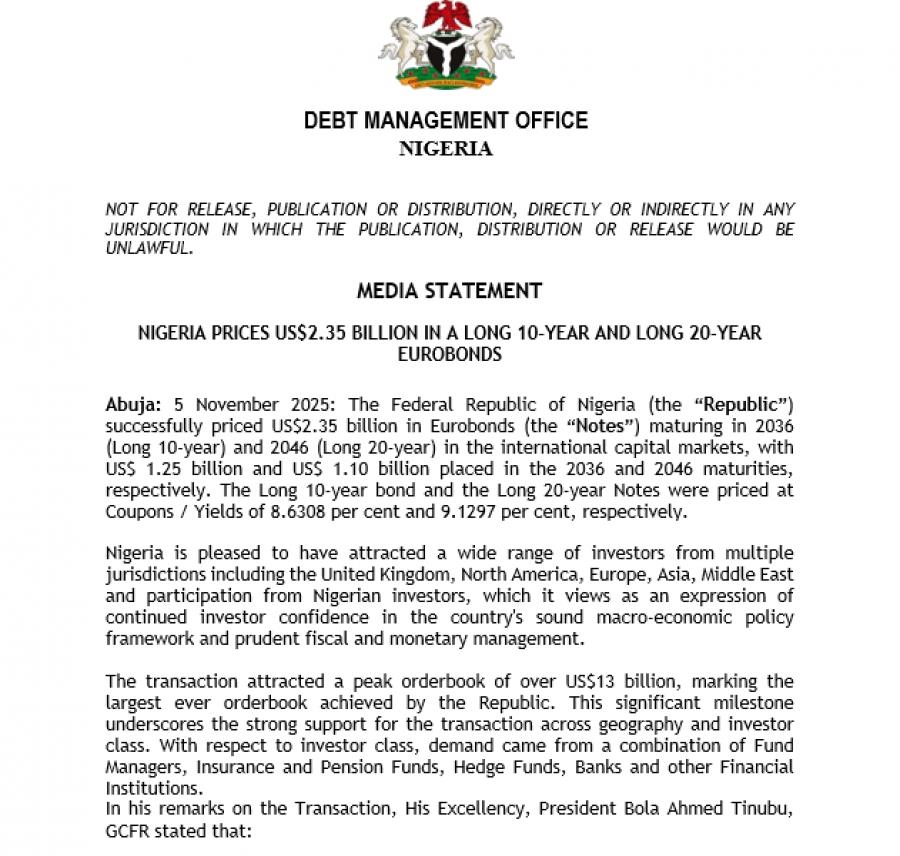Nigeria has successfully raised $2.35 billion through the sale of 10-year and 20-year Eurobonds, marking a significant achievement in its financial strategy. The transaction, announced on Wednesday, attracted a staggering $13 billion in orders, the largest-ever demand for Nigerian sovereign debt. The sale, conducted through the country's Debt Management Office, highlights strong investor confidence in Nigeria's economic recovery prospects despite ongoing challenges.