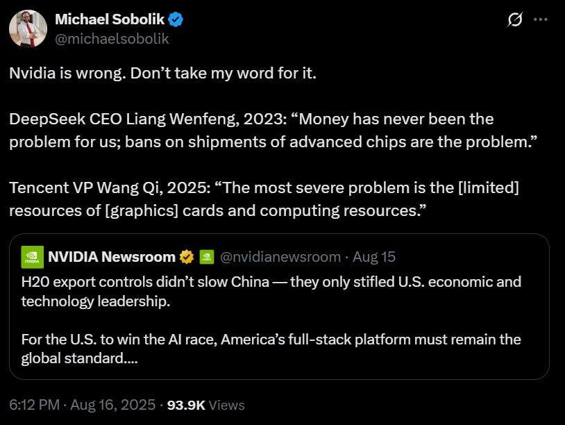 Meanwhile, China's technologists themselves seem pretty upset about the export controls, and admit that they're holding back the country's AI industry. Here are a couple of quotes: