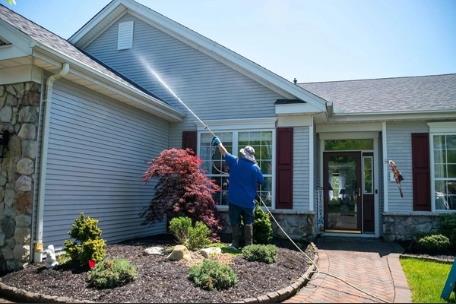 "A professional from Nubirth Pressure Washing is cleaning the exterior of a home using a high-pressure washer. The image shows water spraying upward toward the siding and eaves, effectively removing dirt and buildup. The scene captures a neat residential setting with a landscaped front yard, illustrating the company's expertise in home exterior cleaning and maintenance."Nubirth Pressure Washing launches a specialized program for concrete and roof cleaning across Jacksonville, using eco-friendly methods and soft-wash techniques tailored to Florida's climate.