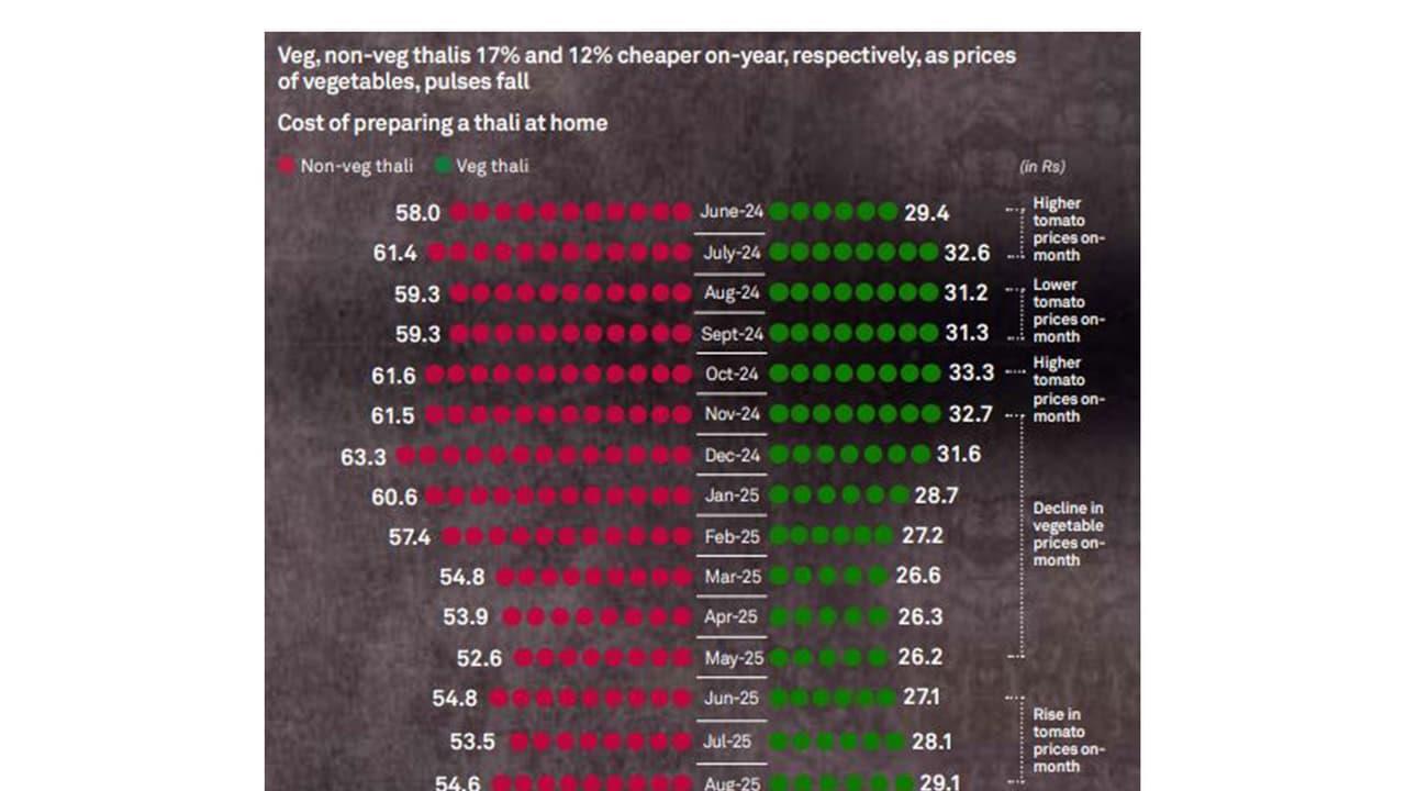 However, month-on-month, the cost of vegetarian and non-vegetarian thalis both fell only 1 per cent and 3 per cent, respectively, in October 2025, it added.