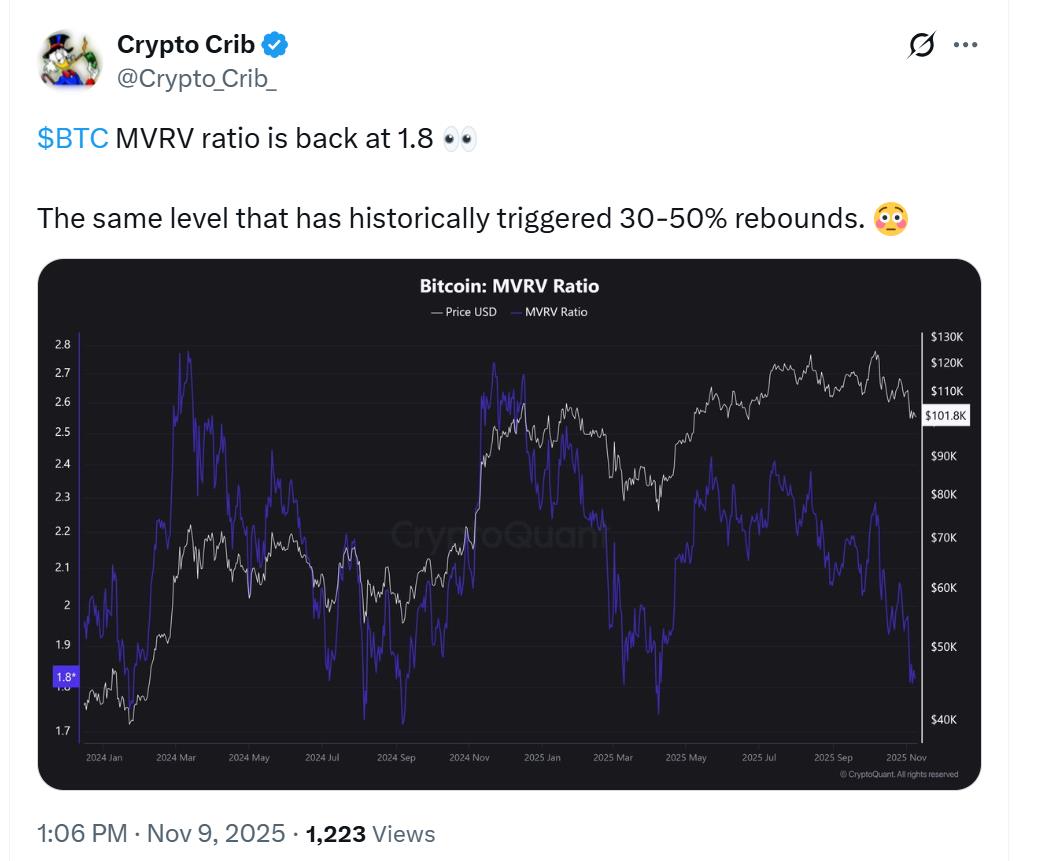 Meanwhile, on-chain data supports a potential bullish reversal for Bitcoin. Market analytics platform Crypto Crib observed the Bitcoin Market Value by Realized Value (MVRV) ratio returning to 1.8 - a level historically associated with 30–50% rebounds in the Bitcoin price.