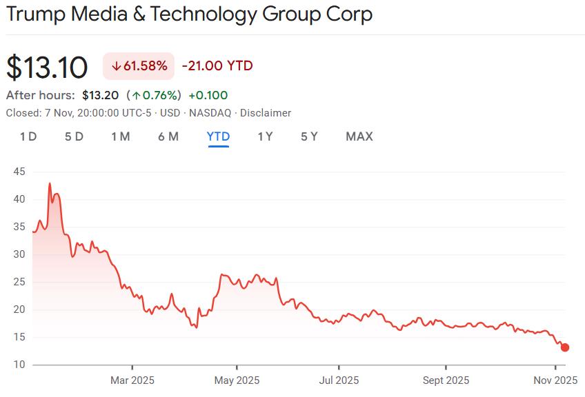 The firm recently reported revenues of just under $1 million, a decline from over $1 million in the previous year. Shares in Trump Media (DJT) responded with a slight dip, closing at $13.10-though they recovered modestly after-hours to $13.20. Still, the company's balance sheet appears strained, and its stock performance has struggled, with a sharp decrease of 61% so far this year.