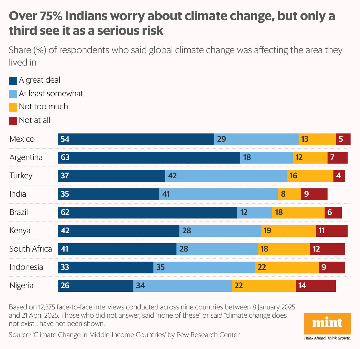A separate survey of 12,375 people by US-based fact tank Pew Research Center, focusing on middle-income countries, revealed widespread alarm across nine nations-Mexico, Argentina, Brazil, Nigeria, South Africa, Kenya, Turkey, India and Indonesia. Mexico led with 83% respondents, saying the climate has impacted local communities, followed closely by Argentina (81%) and Turkey (79%). In India, three-fourths of respondents said climate change is affecting them where they live and work. Over a third of Indian respondents said climate change impacted them“a great deal". This was the third lowest after Indonesia (33%) and Nigeria (26%).