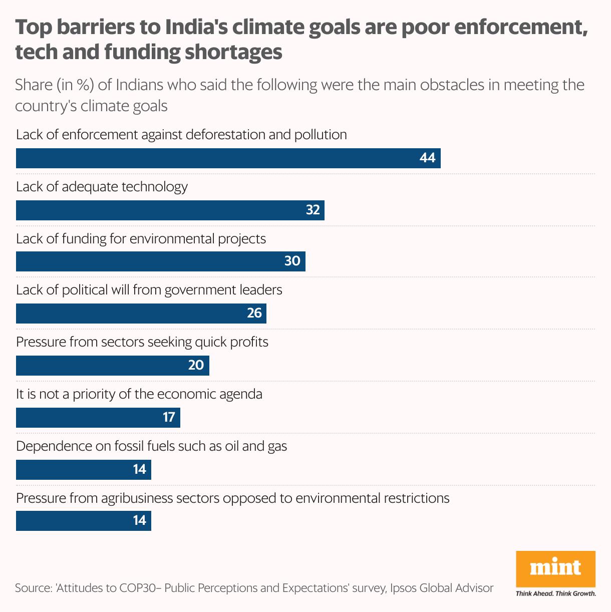 Also Read | Climate threat: Why businesses must watch out for a rising tide of water rIndian respondents identified lack of enforcement against deforestation and pollution (44%) as the primary obstacle, reflecting the current anger against the country's crippling air pollution. Technology gaps followed at 32%, while 30% cited funding shortages for environmental projects. One in four respondents flagged lack of political will from government leaders. Strikingly, only 14% pointed to fossil fuel dependence as the main barrier, despite India's current and future dependence on coal to meet its energy needs.