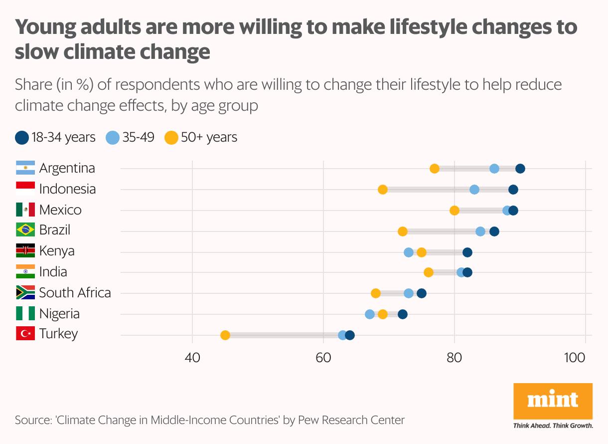 While the leaders of the world struggle to contain the climate crisis, vulnerable communities across the globe are bearing the brunt. Younger people from middle-income countries say they are ready to make changes to their lifestyles, while also pinning hopes on global cooperation to find sustainable solutions. Mint explores two recent surveys that shed light on people's attitudes towards climate change.