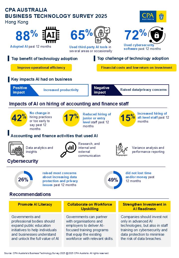 Media OutReach Newswire - 10 November 2025 - CPA Australia's regional survey about business technology adoption shows that most companies in Hong Kong have used artificial intelligence (AI) tools at different levels. Though the increasing AI application helps to improve productivity, it also transforms the hiring trends in the accounting and finance industry, and increases concerns on data protection and governance, according to the survey findings.