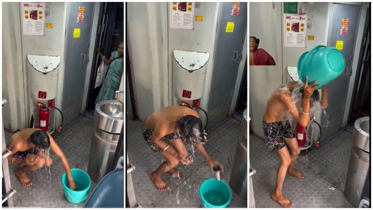A bizarre video showing a man bathing inside the coach of a moving train has sparked outrage and ridicule online. The now-viral clip showing him with a bucket and mug, casually scrubbing himself with soap and water, near the train's toilet area, has reignited debate on how far people are willing to go for digital fame.