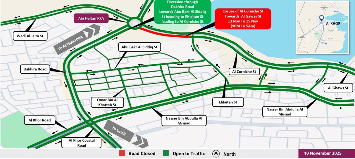 The road closure will take effect from 9pm to 5am starting on Thursday, November 13, until Sunday, November 15, 2025. The affected area will include traffic coming from Ain Heltan Roundabout and heading toward Al Gawas St.