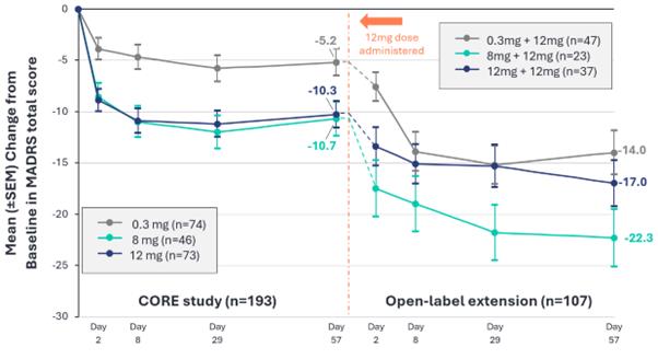 - Mean reduction in MADRS score of 14.0 points at Day 57 in the OLE compared to their baseline at the start of the core study, in line with the antidepressant effects seen in patients who received a single active dose in the core study.