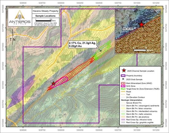 The new results validate the geological model within the southwestern portion of the MMZ, confirming that mineralization extends to surface as predicted. Historical drilling and 3-D modelling previously defined this same horizon as part of the NHC Zone, which included intercepts such as 4.0% Pb, 9.8% Zn, 37 g/t Ag and 0.6 g/t Au over 6.0 m (May 1, 2025 ). Together with high-grade lead-zinc-silver results reported from the same area (July 3, 2025 ), the program confirms the strength and continuity of the system. Importantly, the broader MMZ remains open along strike to the northeast, where Anteros recently discovered high-grade copper-gold-silver mineralization approximately 775 metres away (see June 16, 2025 News Release ). Collectively, these datasets highlight a mineralized corridor in excess of 800 metres of strike with multiple high-priority zones for follow-up.