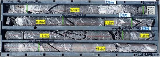 Figure 1: WDG-12 core from 125.37-128.92m (Zone 1) showing high-grade quartz-sulphide veins and gold grades up to 68.2 g/t Au.