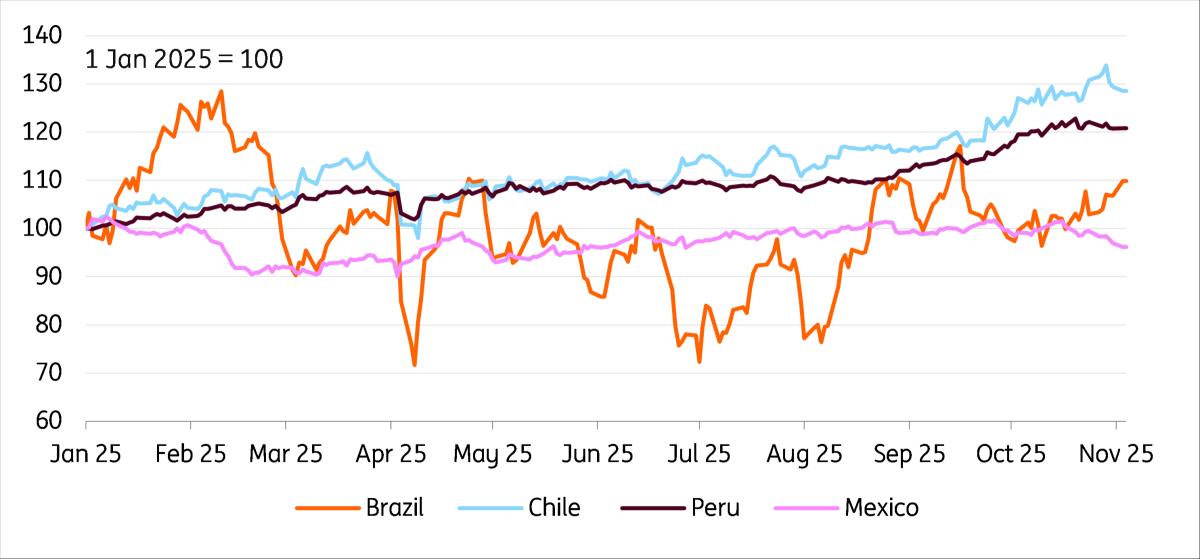 Local politics in focus: President Claudia Sheinbaum is seen to have had a successful first year in office. Her approval ratings remain above 70% – largely since she is seen as having deftly handled negotiations with President Trump. Global markets have largely moved on from the story of judicial reform, which rocked the peso in summer 2024. Looking ahead into 2026, her plans will be to progress 'Plan Mexico', aiming to shift Mexico from the 12th to the 10th largest global economy – largely through investment and reducing dependency on Asian imports. The ability to progress on any of this will be welcomed by markets, particularly if it can raise anaemic growth levels. Any shift away from this and fiscal responsibility towards social spending ahead of the 2027 mid-term elections would alternatively weigh on the peso.
