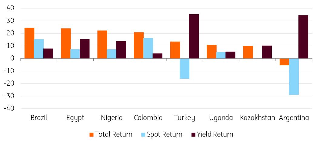 High reward, high riskAny play in the Argentine peso would be similar, too, by expecting the managed ARS depreciation to be less than priced into the forward curve. Egypt and Nigeria are proving different propositions – these offer high yields and have delivered nominal appreciation too. So has the Brazilian real.