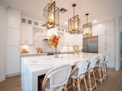 "A luxurious kitchen designed by Mahogany LLC, showcasing a bright, open-concept layout with a large marble island and waterfall edges. The space features elegant white cabinetry with gold hardware, modern pendant lighting, and natural wood flooring. The combination of soft neutrals, metallic accents, and sleek finishes creates a warm yet sophisticated atmosphere perfect for both everyday living and entertaining."Palm Beach County cabinet professionals explain the industry's 1/3 rule, stating that custom cabinetry should account for 33% of kitchen renovation budgets for optimal results and value.