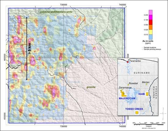 Diamond drilling at Majorodam, Suriname confirms the presence of a mineralized zone at least 800 m long at Heuvel Main in addition to a second zone at Heuvel East.